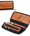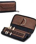 The LYKKE Oxford - Denim & Vegan Leather Small Interchangeable Needle Case offers a secure and fashionable way to store your needles and hooks. Made with a combination of denim and vegan leather, this case features a zipper closure and exterior pocket for accessories. Choose from chocolate or camel vegan leather accents for a practical and stylish needle storage solution on the go. Fits nine 3.5" (9cm) needle tips.