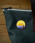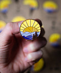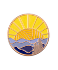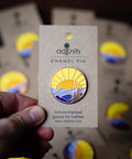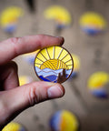 Inspired by the Blue Ridge Mountains of Shenandoah National Park, this enamel pin has a ball of yarn sunshine setting over a blue mountain range. Decorate your project bag with a little bit of nature-loving fiber flair!
