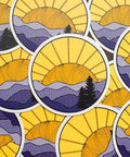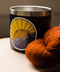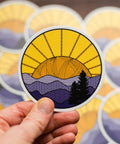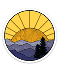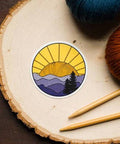 Inspired by the Blue Ridge Mountains of Shenandoah National Park, this knitted mountains sticker has a ball of yarn sunshine setting over a mountain range of knitted stitches.  Decorate your water bottle, notebook, or laptop with a little bit of nature-loving knitting flair! * Resistant to scratches, water, and sunlight * 3 x 3 inches