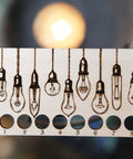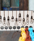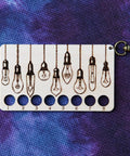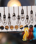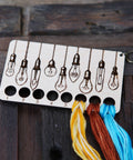 Edison Filament Light Bulbs Embroidery Floss Thread Storage Holder - Rectangle Maple Wood To Store Your Cross Stitch Needlepoint Edison Filament Light Bulbs embroidery floss organizer made from maple wood. This vintage incandescent filament light bulb needlepoint thread holder has 8 circles to keep your yarn organized and has a clasp at the end to hook onto your cross-stitch bag for easy access. This thread tool measures 4 inches wide by 2.25 inches tall and comes with a brass clasp to hang on your craft bag. Since each piece of wood is unique, the item you receive may be slightly different from the photos.