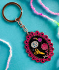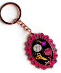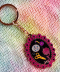 This enamel keychain is a great way to show off your love of knitting! The keychain is shaped like a lace knitting project with all the tools you would need to knit it inside the needles including scissors, a pink yarn ball, stitch markers, and a tape measure. It of course works great to hold your keys but it would also be super cute just attached to your project bag as a fun accessory.
