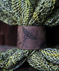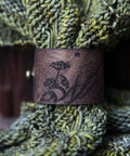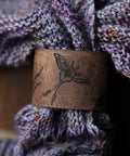 Luna Moth With Moon & Stars Shawl Cuff, Made From Leather With A Bronze Stud. Great For Your Knitted And Crocheted Scarves, Shawls And Cowls This brown leather luna moth with yarrow plant and leaves along with the night sky of moon and stars shawl cuff is a perfect way to hold your knitted and crocheted cowls, shawls, and scarves in place. The 6-inch cuff measures approximately 6 inches X 1.4 inches using 3-4 oz leather. The inside diameter is 1.5 inches. The bronze clasp stud hooks the ends together. This cuff works well with lighter weight Shawls/Scarves. The 7-inch cuff measures approximately 7 inches X 1.6 inches using 3-4 oz leather. The inside diameter is 2 inches. The bronze clasp stud hooks the ends together. This cuff works well with medium-weight Shawls/Scarves. This moth scarf fastener is a perfect accent for your knit and crochet wear. Since each piece of leather is unique, the item you receive may be slightly different from the photos.