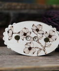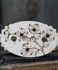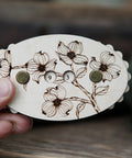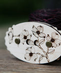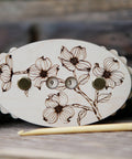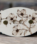A row counter is an important tool for any knitter or crocheter out there. This counter features dogwood tree flowers on a branch. This oval knitting and crochet row counter is made is made from maple wood and contains two numbered wheels which are rotated to keep count of the finished rows. Numbers can go from 0-99.
