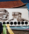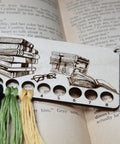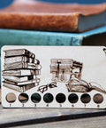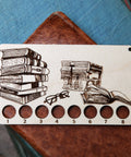 Book Stack With Reading Glasses Embroidery Floss Thread Storage Holder - Rectangle Maple Wood To Store Your Cross Stitch Needlepoint Embroidery floss organizer made from maple wood. This stack of books with reading glasses needlepoint thread holder has 8 circles to keep your yarn organized and has a clasp at the end to hook onto your cross stitch bag for easy access. Great for any bookworm or book lover like me. I like fantasy novels but have been known to read a biography or two. This thread tool measures 4 inches wide by 2.25 inches tall and comes with a brass clasp to hang on your craft bag. Since each piece of wood is unique, item you receive may be slightly different from photos.
