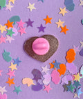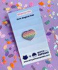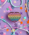 Share your love of knitting with this cute little chubby heart pin patterned with stockinette stitch! Each row is a different stripe of pastel rainbow goodness that is filled with glitter. It would be super cute on any project bag that needs some extra flair! This makes a great companion pin to my Craft Witch Magical Merit Badge.