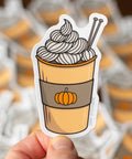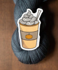 What's fall without a warm beverage? This cozy fall sticker features a pumpkin spice latte topped with a swirl of whipped cream yarn and a couple of knitting needles for good measure!